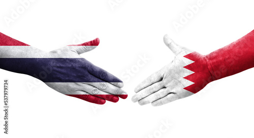 Handshake between Bahrain and Thailand flags painted on hands, isolated transparent image.