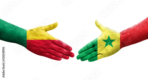 Handshake between Benin and Senegal flags painted on hands, isolated transparent image.