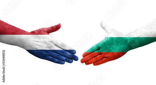Handshake between Bulgaria and Netherlands flags painted on hands, isolated transparent image.