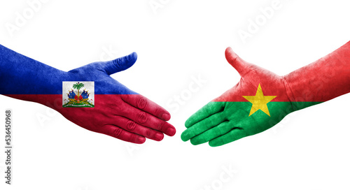 Handshake between Burkina Faso and Haiti flags painted on hands, isolated transparent image.
