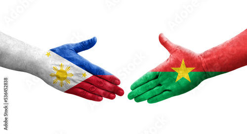 Handshake between Burkina Faso and Philippines flags painted on hands, isolated transparent image.