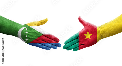Handshake between Cameroon and Comoros flags painted on hands, isolated transparent image.
