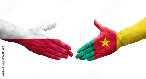 Handshake between Cameroon and Poland flags painted on hands, isolated transparent image.