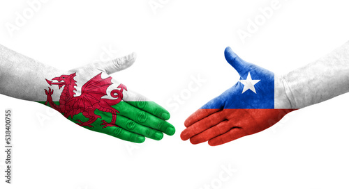Handshake between Chile and Wales flags painted on hands, isolated transparent image.