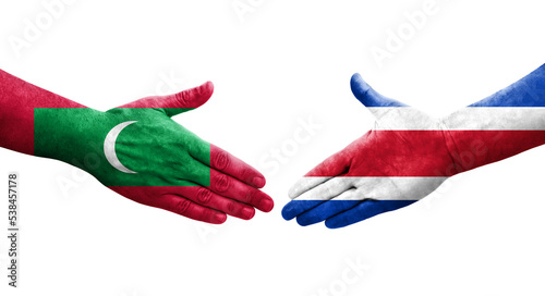 Handshake between Costa Rica and Maldives flags painted on hands, isolated transparent image.