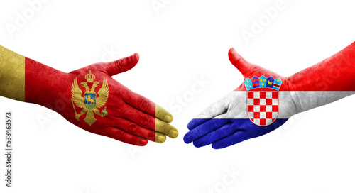 Handshake between Croatia and Montenegro flags painted on hands, isolated transparent image.