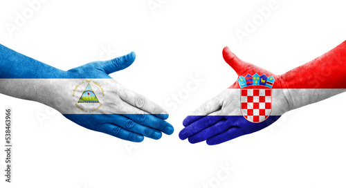 Handshake between Croatia and Nicaragua flags painted on hands, isolated transparent image.