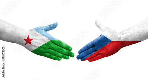 Handshake between Czechia and Djibouti flags painted on hands, isolated transparent image.