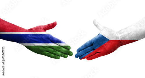 Handshake between Czechia and Gambia flags painted on hands, isolated transparent image.