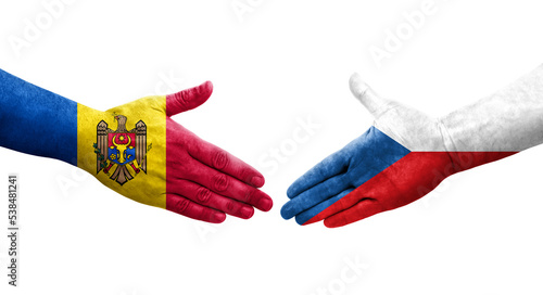 Handshake between Czechia and Moldova flags painted on hands, isolated transparent image.