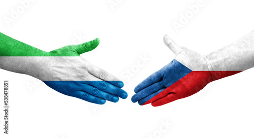 Handshake between Czechia and Sierra Leone flags painted on hands, isolated transparent image.