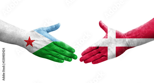 Handshake between Denmark and Djibouti flags painted on hands, isolated transparent image.