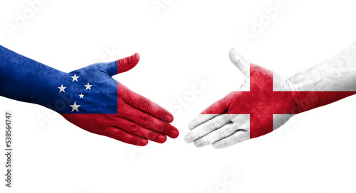 Handshake between England and Samoa flags painted on hands, isolated transparent image.