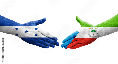 Handshake between Equatorial Guinea and Honduras flags painted on hands, isolated transparent image.