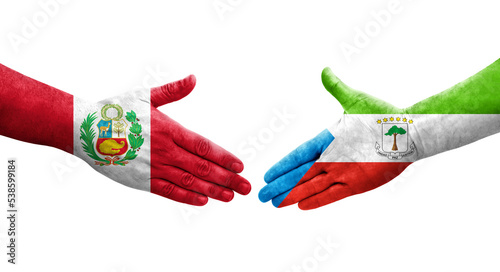 Handshake between Equatorial Guinea and Peru flags painted on hands, isolated transparent image.