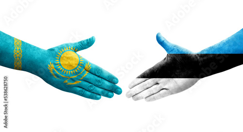 Handshake between Estonia and Kazakhstan flags painted on hands, isolated transparent image.