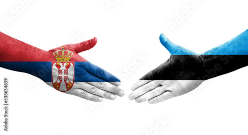 Handshake between Estonia and Serbia flags painted on hands, isolated transparent image.