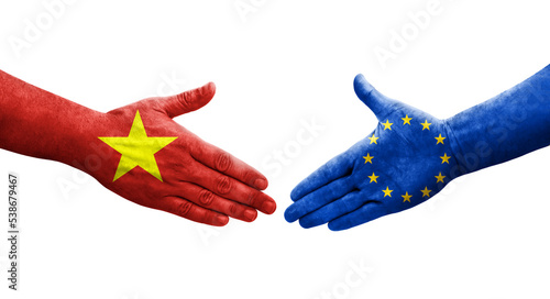 Handshake between European Union and Vietnam flags painted on hands, isolated transparent image.