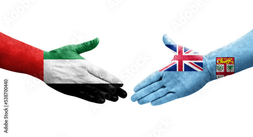Handshake between Fiji and UAE flags painted on hands, isolated transparent image.