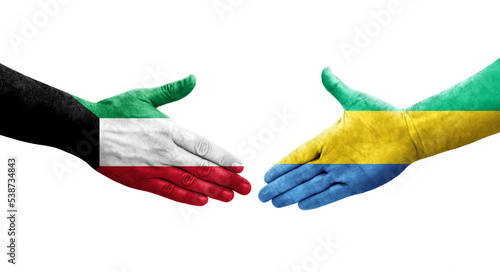 Handshake between Gabon and Kuwait flags painted on hands, isolated transparent image.