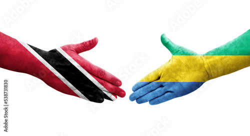 Handshake between Gabon and Trinidad Tobago flags painted on hands, isolated transparent image.