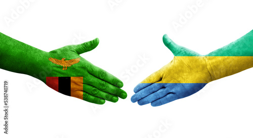 Handshake between Gabon and Zambia flags painted on hands, isolated transparent image.