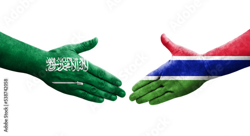 Handshake between Gambia and Saudi Arabia flags painted on hands, isolated transparent image.