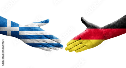 Handshake between Germany and Greece flags painted on hands, isolated transparent image.