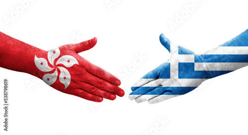 Handshake between Greece and Hong Kong flags painted on hands, isolated transparent image.