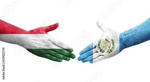 Handshake between Guatemala and Hungary flags painted on hands, isolated transparent image.