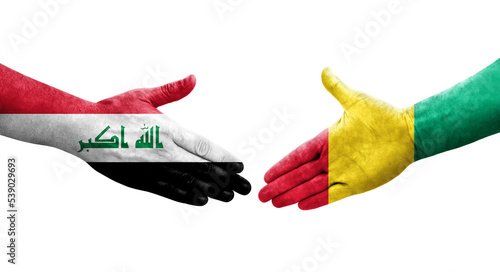 Handshake between Guinea and Iraq flags painted on hands, isolated transparent image.