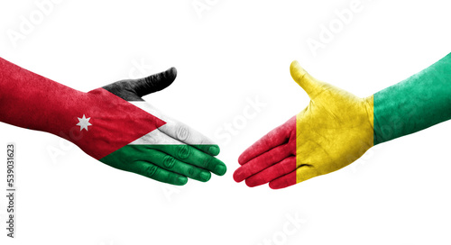 Handshake between Guinea and Jordan flags painted on hands, isolated transparent image.