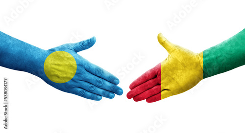 Handshake between Guinea and Palau flags painted on hands, isolated transparent image.