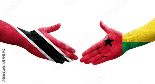 Handshake between Guinea Bissau and Trinidad Tobago flags painted on hands, isolated transparent image.