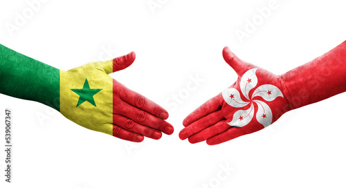 Handshake between Hong Kong and Senegal flags painted on hands, isolated transparent image.