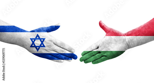Handshake between Hungary and Israel flags painted on hands, isolated transparent image.