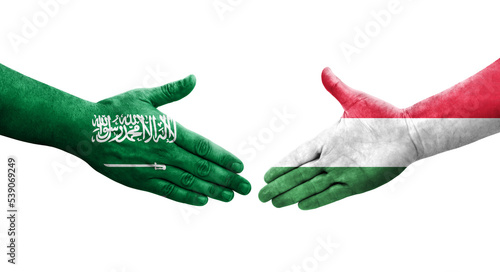 Handshake between Hungary and Saudi Arabia flags painted on hands, isolated transparent image.
