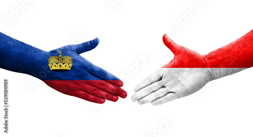 Handshake between Indonesia and Liechtenstein flags painted on hands, isolated transparent image.