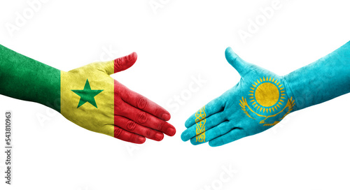 Handshake between Kazakhstan and Senegal flags painted on hands, isolated transparent image.