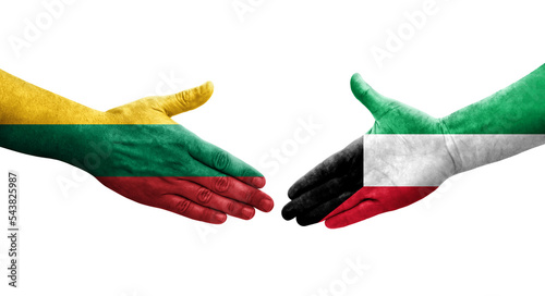 Handshake between Kuwait and Lithuania flags painted on hands, isolated transparent image.