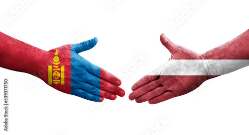 Handshake between Latvia and Mongolia flags painted on hands, isolated transparent image.