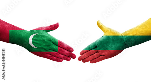 Handshake between Lithuania and Maldives flags painted on hands, isolated transparent image.