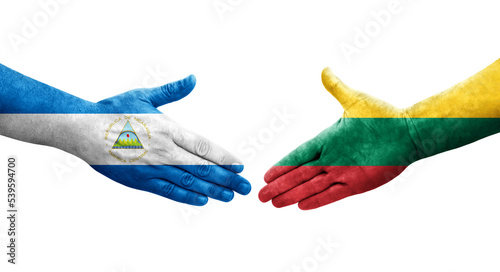 Handshake between Lithuania and Nicaragua flags painted on hands, isolated transparent image.