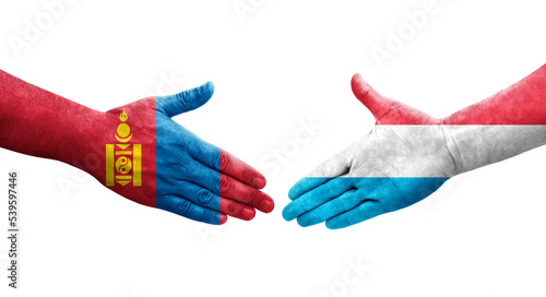 Handshake between Luxembourg and Mongolia flags painted on hands, isolated transparent image.