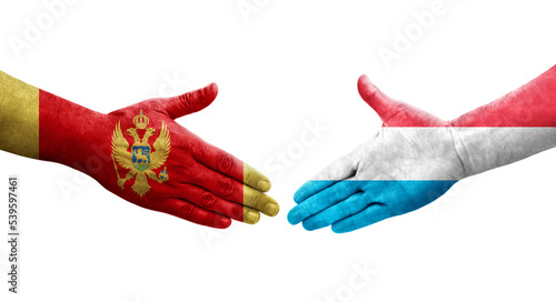 Handshake between Luxembourg and Montenegro flags painted on hands, isolated transparent image.