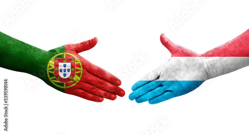 Handshake between Luxembourg and Portugal flags painted on hands, isolated transparent image.