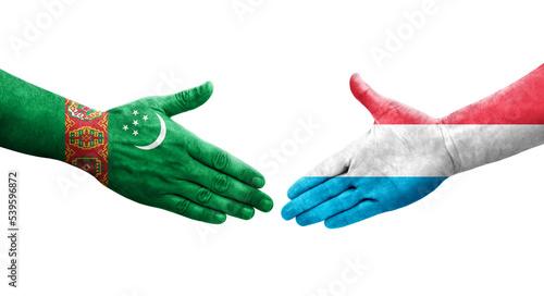 Handshake between Luxembourg and Turkmenistan flags painted on hands, isolated transparent image.