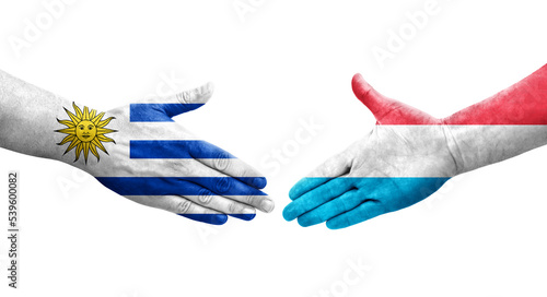 Handshake between Luxembourg and Uruguay flags painted on hands, isolated transparent image.
