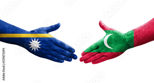Handshake between Maldives and Nauru flags painted on hands, isolated transparent image.