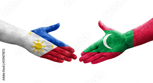 Handshake between Maldives and Philippines flags painted on hands, isolated transparent image.